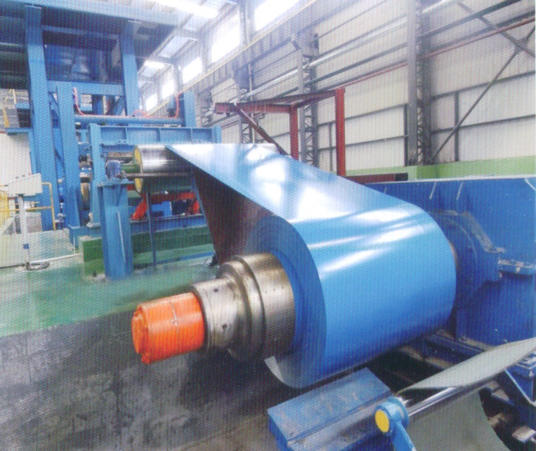 彩涂板生產(chǎn)線彩色涂層鋼板是以冷軋鋼板和鍍鋅鋼 板為基板,彩涂板生產(chǎn)線表面預(yù)脫脂、清洗、化學(xué)轉(zhuǎn)化處理),以連續(xù)的方法涂上涂料(輥涂法), 經(jīng)過烘烤和冷卻而制成的產(chǎn)品。涂層鋼板具有輕質(zhì) 、美觀和良好的防腐蝕性能,又可直接加工,它給 建筑業(yè)、造船業(yè)、車輛制造業(yè)、家具行業(yè)、電氣行 業(yè)等提供了一種新型原材料,起到了以鋼代木、高效施工、節(jié)約能源、防止污染等良好效果。